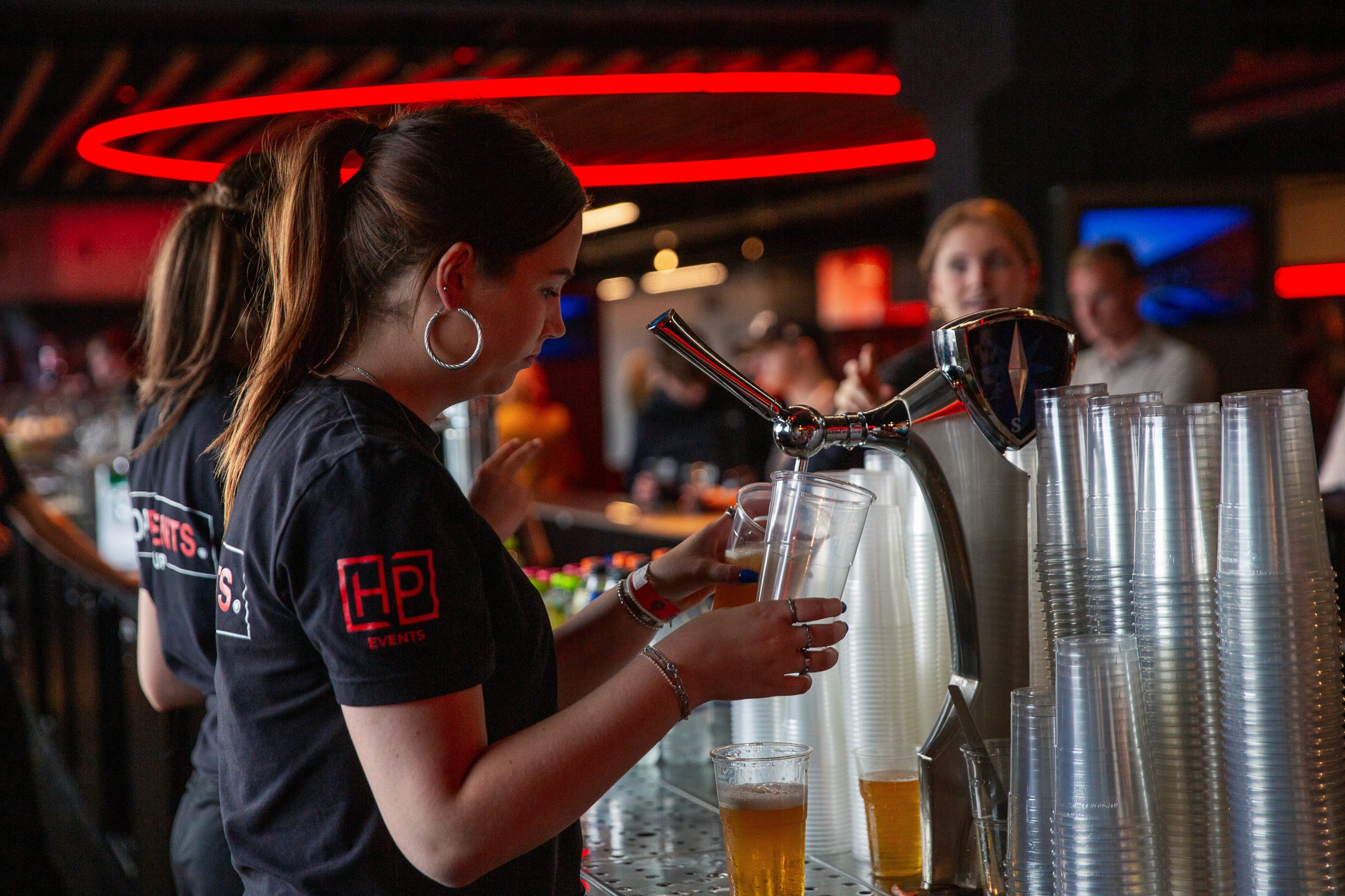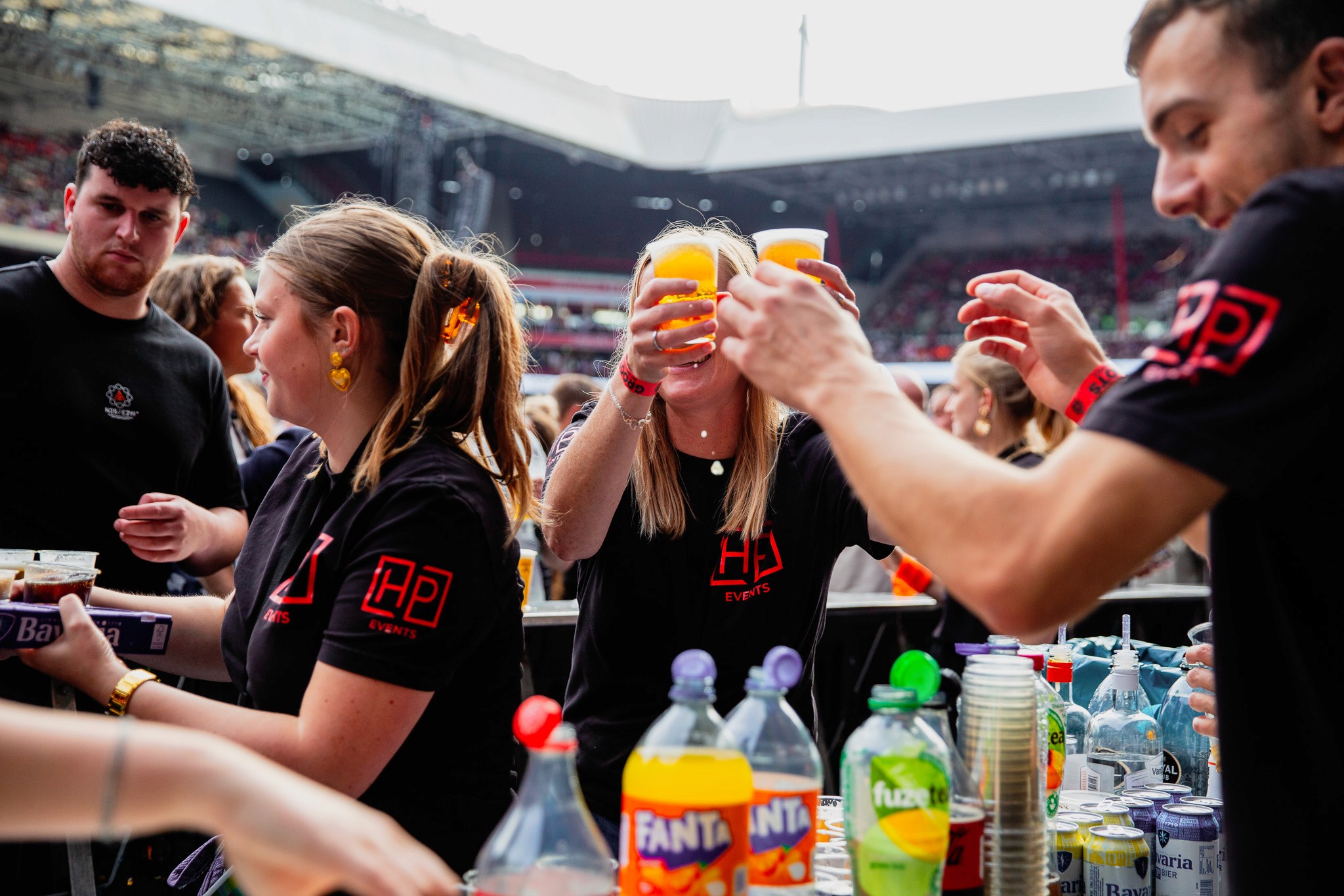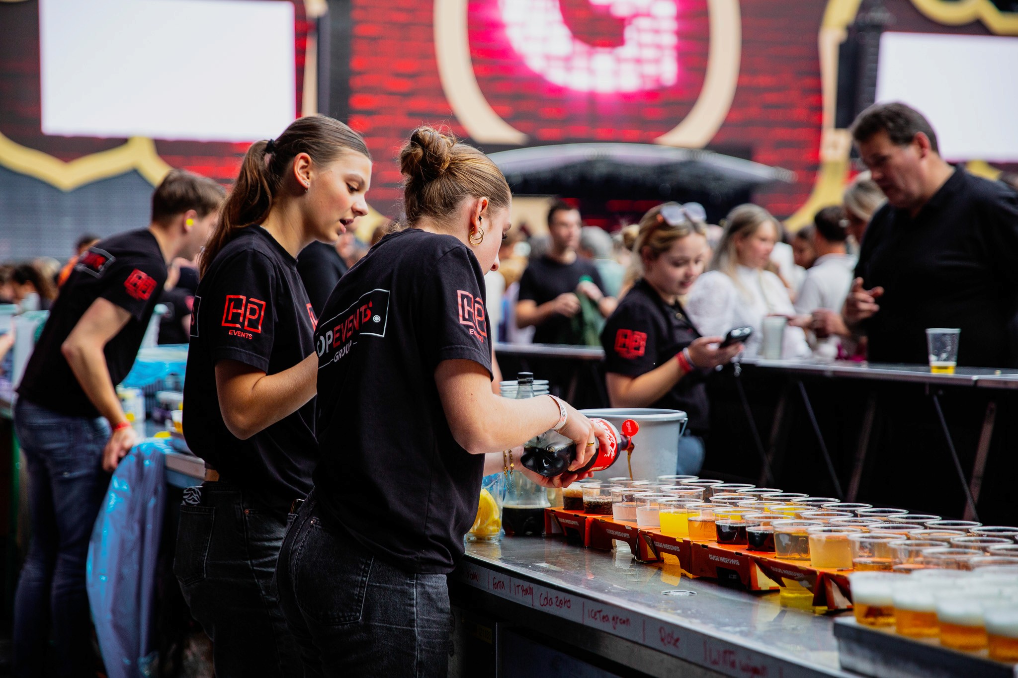 Sfeervolle, energieke beelden van het barpersoneel tijdens een van de evenementen die HP-Event verzorgt. De fotografie legt niet alleen de gezelligheid vast, maar ook de inzet en het teamwork achter de schermen, waardoor de sfeer van het evenement écht tot leven komt.